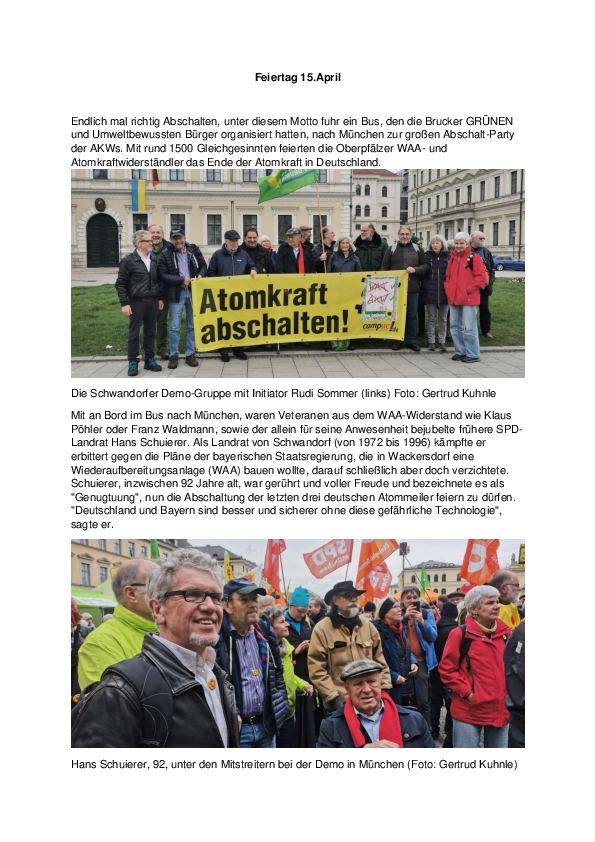 Die Kernkraftwerke in Deutschland wurden endlich vom Netz genommen - gem. dem Beschluss der Bundesregierung nach den Ereignissen in Fukushima im März 2011. Hier finden Sie den Presseartikel von Rudi Sommer, der von Bruck aus eine Fahrt zur zentralen Veranstaltung in München zur Feier dieses denkwürdigen Tages organisiert hat.