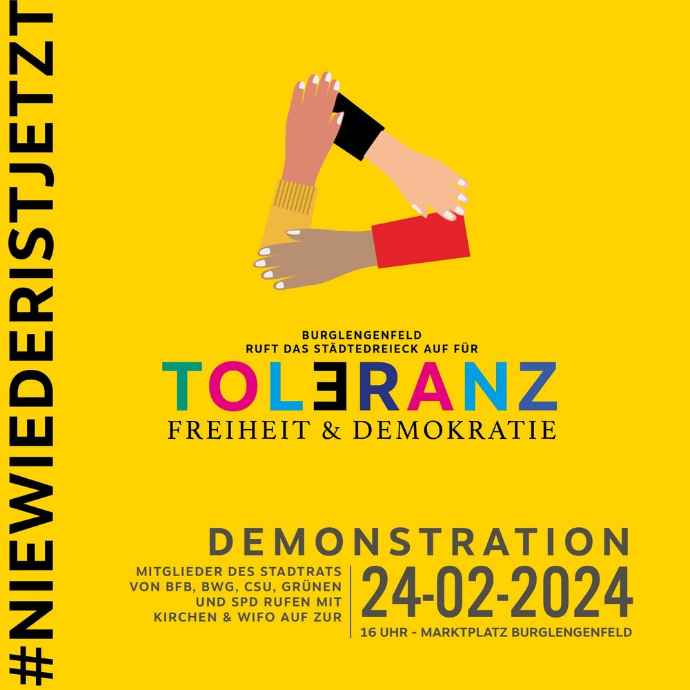Ein breites überparteiliches Bündnis, unterstützt von Wirtschaftsforum und den katholischen und evangelischen Kirchengemeinden ruft auf zu einer Demonstration für Freiheit und Toleranz.